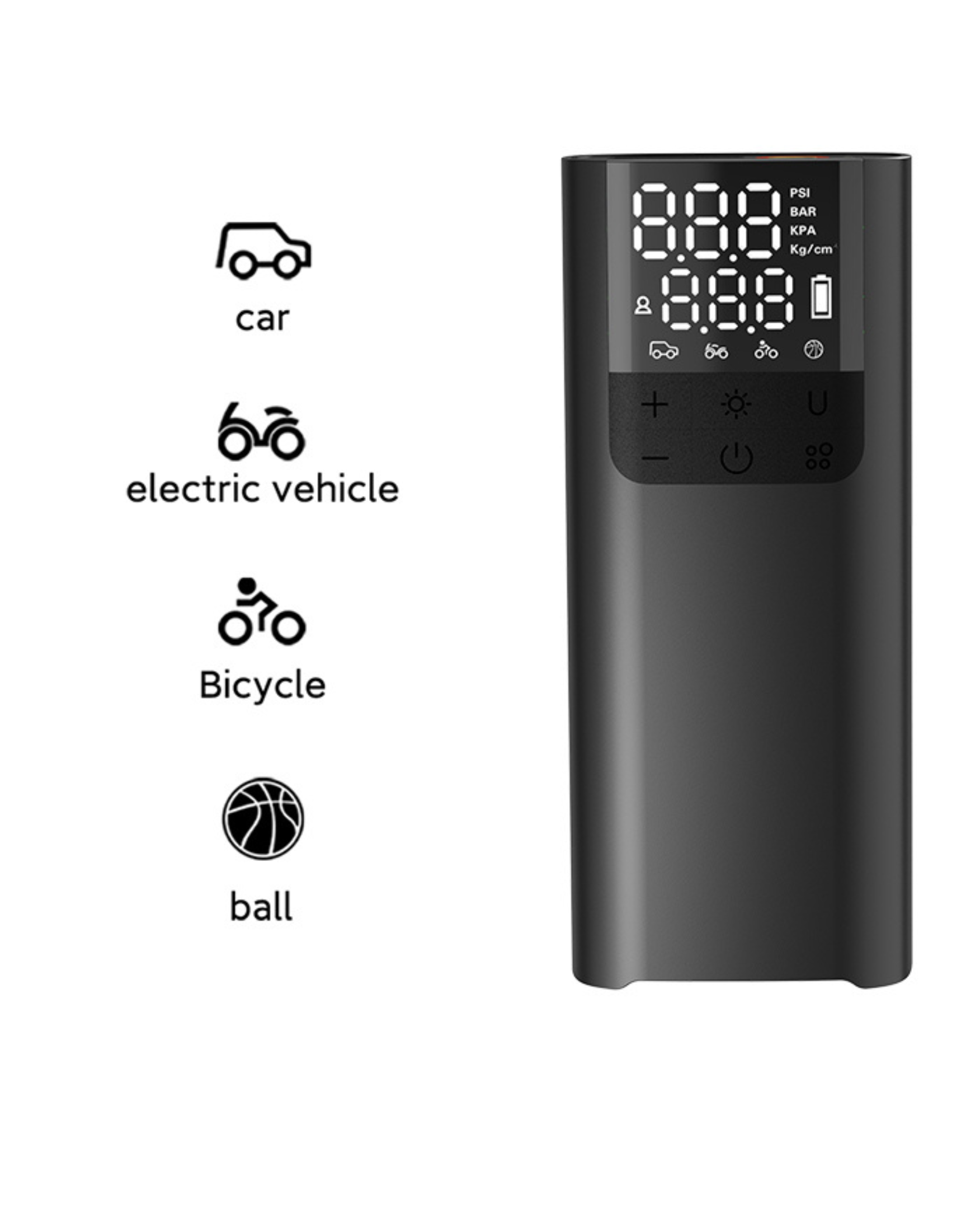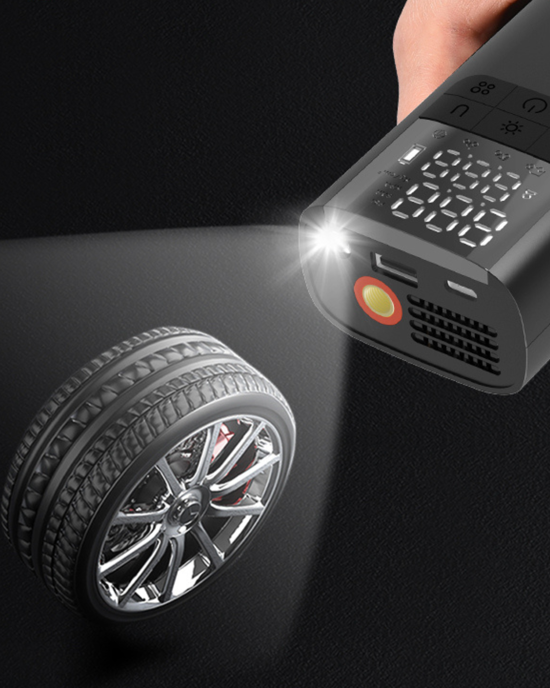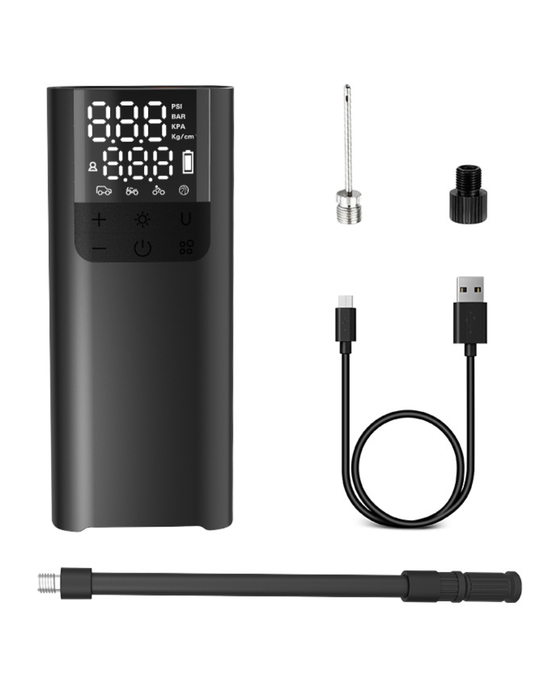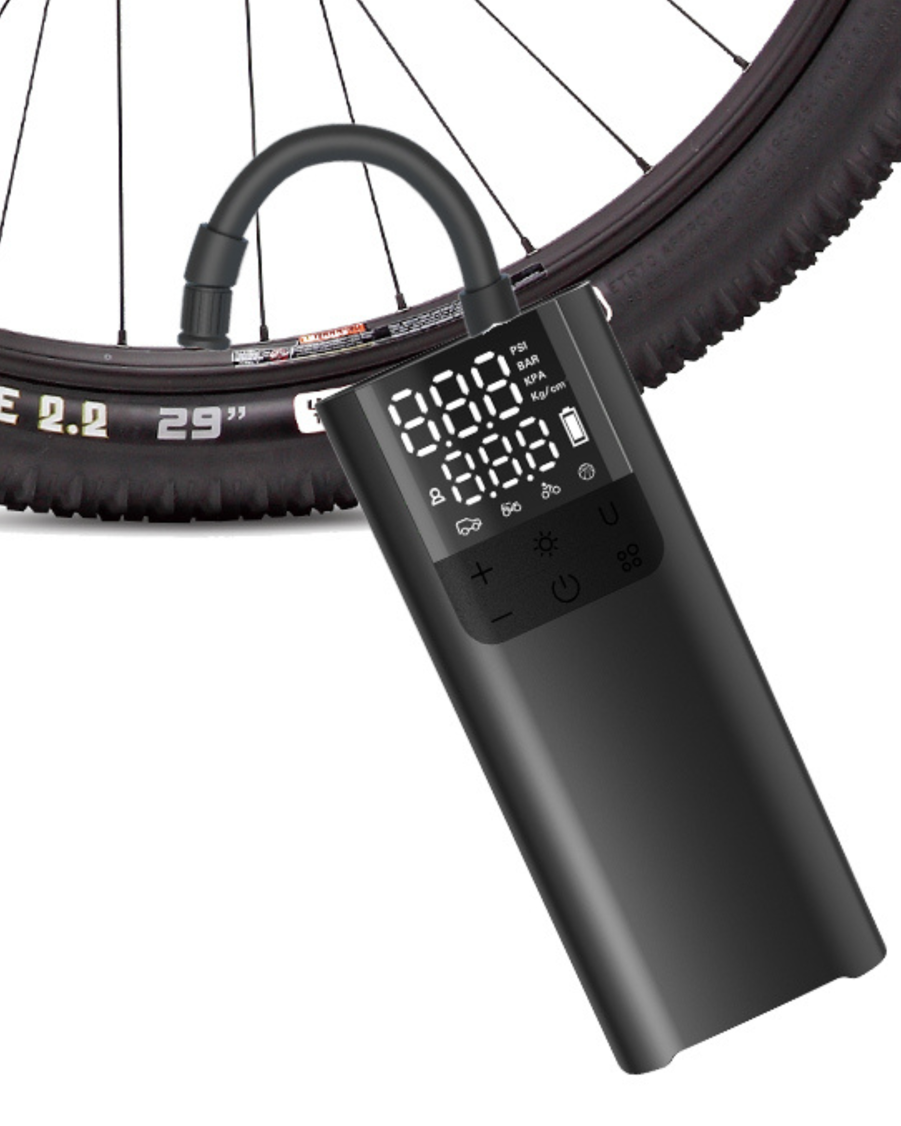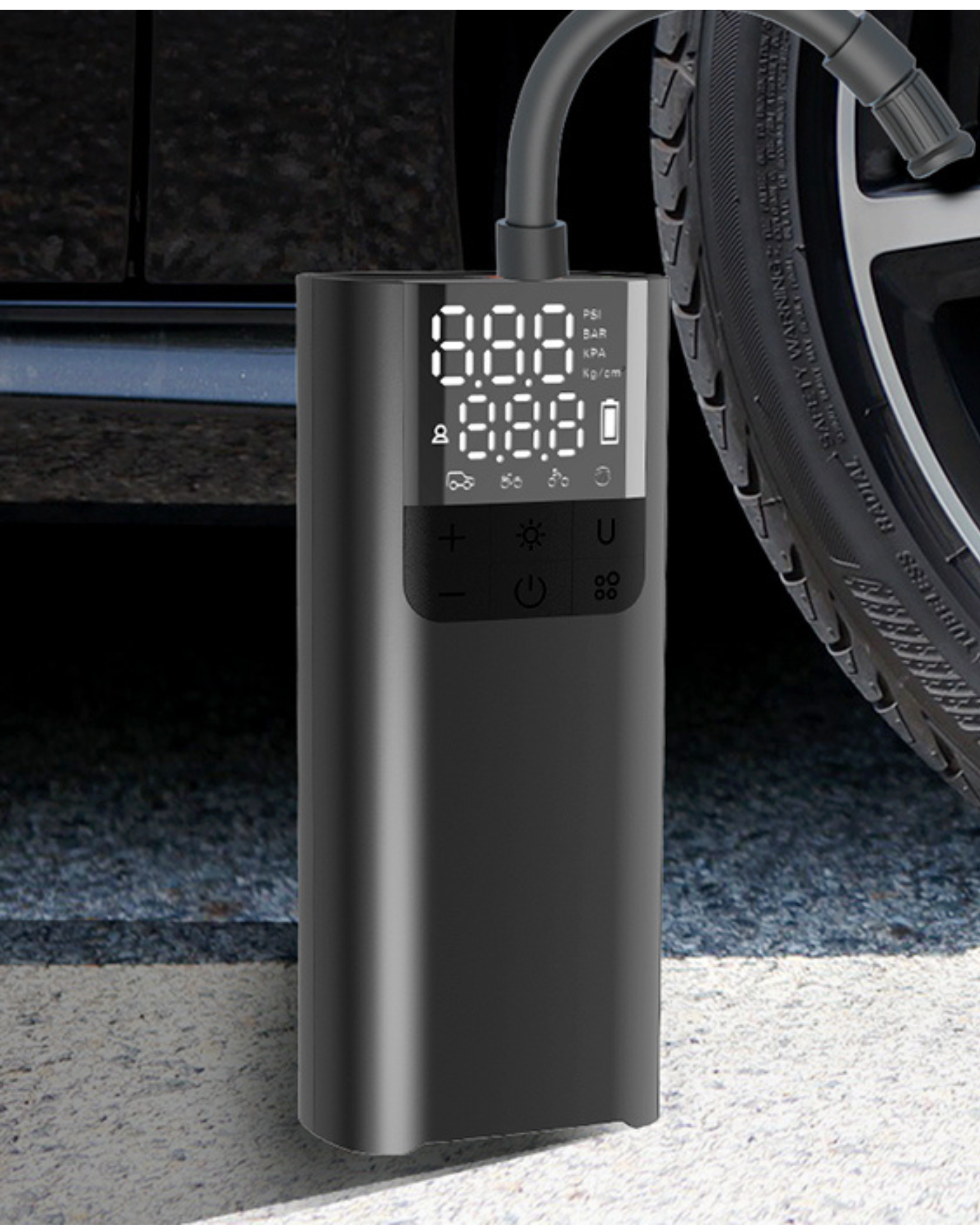 A versatile and portable inflator that easily switches between functions for inflating car tires, sports balls, and other inflatables. It features simple preset controls for automatic inflation, along with a built-in power bank to charge your devices on the go. The inclusion of dual air hoses ensures seamless switching between tire and ball inflation.